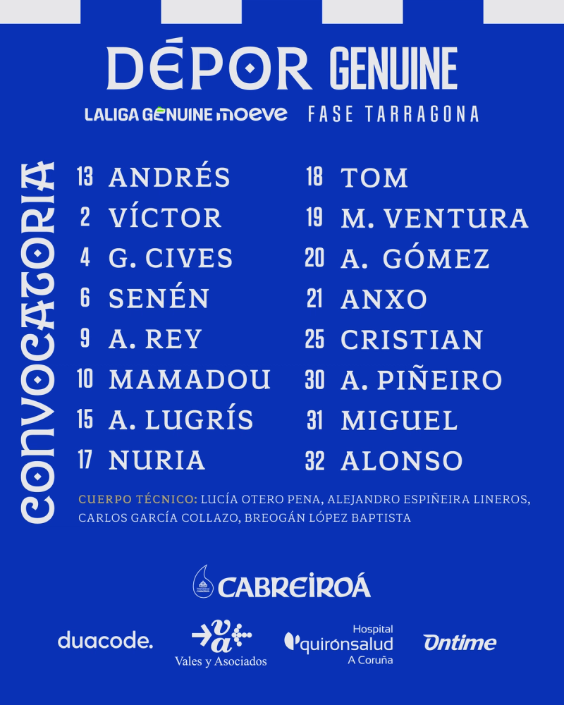El Dépor Genuine inicia este fin de semana en Tarragona la 8ª edición de LaLiga Genuine Moeve, que se celebrará en las instalaciones del Mediterranean Sports Hub.Esta temporada, la competición estará distribuida en 5 sedes, además de la fase final, con este calendario:Tarragona: 20, 21 y 22 de noviembreCádiz: 31 de enero y 1 de febrero en la Ciudad Deportiva Bahía de CádizGijón: 7 y 8 de marzo en MareoGranada: 25 y 26 de abril en la Ciudad Deportiva del Granada CFBurgos: 30 y 31 de mayo en la Ciudad Deportiva del Burgos CFCiudad del Fútbol de Las Rozas: 19, 20 y 21 de junioEn esta fase final se determinarán los 3 campeones de Fair Play y los 3 campeones deportivos de una temporada llena de sorpresas.