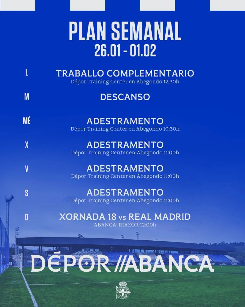El Dépor ABANCA, este martes 27 con jornada de descanso, encara desde mañana miércoles 28 de enero una semana de "muchísima ilusión", tal y como la definió Fran Alonso, con la visita del Real Madrid CF a ABANCA-RIAZOR prevista para el domingo 1 de febrero a las 12:00 (Dazn).El técnico deportivista valora además jugar en casa, "donde nos mostramos muy fuertes" y espera que #ANOSAFORZA "se ilusione, venga a vernos, a apoyarnos. Les necesitamos de verdad para competir al máximo nivel y a lo mejor poder sacar algo contra un súper equipo".Los resultados de la jornada, con el triunfo en Las Gaunas ante el DUX Logroño, dejó a As Nosas en 12ª posición con 17 puntos.El cuerpo técnico dispuso de 4 sesiones matinales en el Dépor Training Center para preparar el encuentro, con esta planificación:Miércoles 28 de enero10:30 h.Jueves 29 de enero11:00 h.Viernes 30 de enero11:00 h.Sábado 31 de enero11:00 h.Domingo 1 de febrero12:00: Dépor ABANCA - Real Madrid CF, en ABANCA-RIAZOR