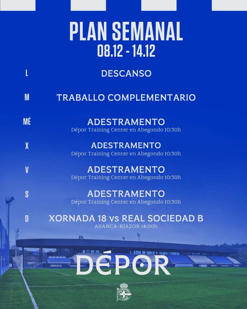 El Dépor, este martes 9 de diciembre con trabajo complementario orientado a lesionados y a futbolistas con planes específicos de entrenamiento, arrancará este miércoles 10 de diciembre la preparación del siguiente partido liguero, la visita de la Real Sociedad B a ABANCA-RIAZOR prevista para este domingo 14 de diciembre a las 14:00 (LaLiga TV Hypermotion).Los resultados de la última jornada, con la derrota ante el CD Castellón, dejaron a Os Nosos en la 2ª posición con 32 puntos, los mismos que la UD Almería (3º); y a 3 puntos del Real Racing Club, líder con 35.Miguel Loureiro pide asumir ese resultado adverso "con calma, con naturalidad. Analizarlo con calma durante la semana como hacemos cuando ganamos también".Insiste en "seguir todos juntos trabajando en el día a día como venimos haciendo para encarar el partido ante la Real B con ganas y con mucha fuerza".El zaguero deportivista asegura que la acción del segundo gol castellonense, en un remate de un córner de un futbolista que acababa de salir del banquillo, "la veremos durante la semana y trataremos de trabajarlas como hacemos antes de cada partido".Antonio Hidalgo dispondrá de 4 sesiones de trabajo matinales entre los campos 2 y 3 del Dépor Training Center con esta planificación:Miércoles 10 de diciembre10:30 h.Jueves 11 de diciembre10:30 h.Viernes 12 de diciembre10:30 h.Sábado 13 de diciembre10:30 h.Domingo 14 de diciembre14:00: Deportivo - Real Sociedad B, en ABANCA-RIAZOR